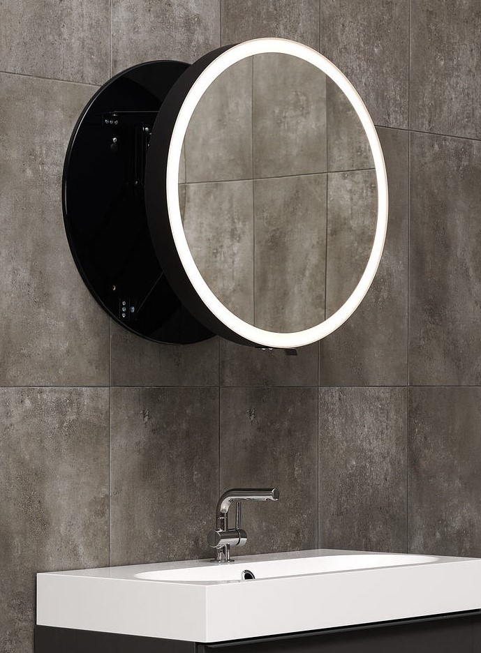 Nowoczesne, czarne lustro wysuwane o średnicy 80 cm wyposażone w mechanizm AXIO-LINK oraz oświetlenie typu LED.