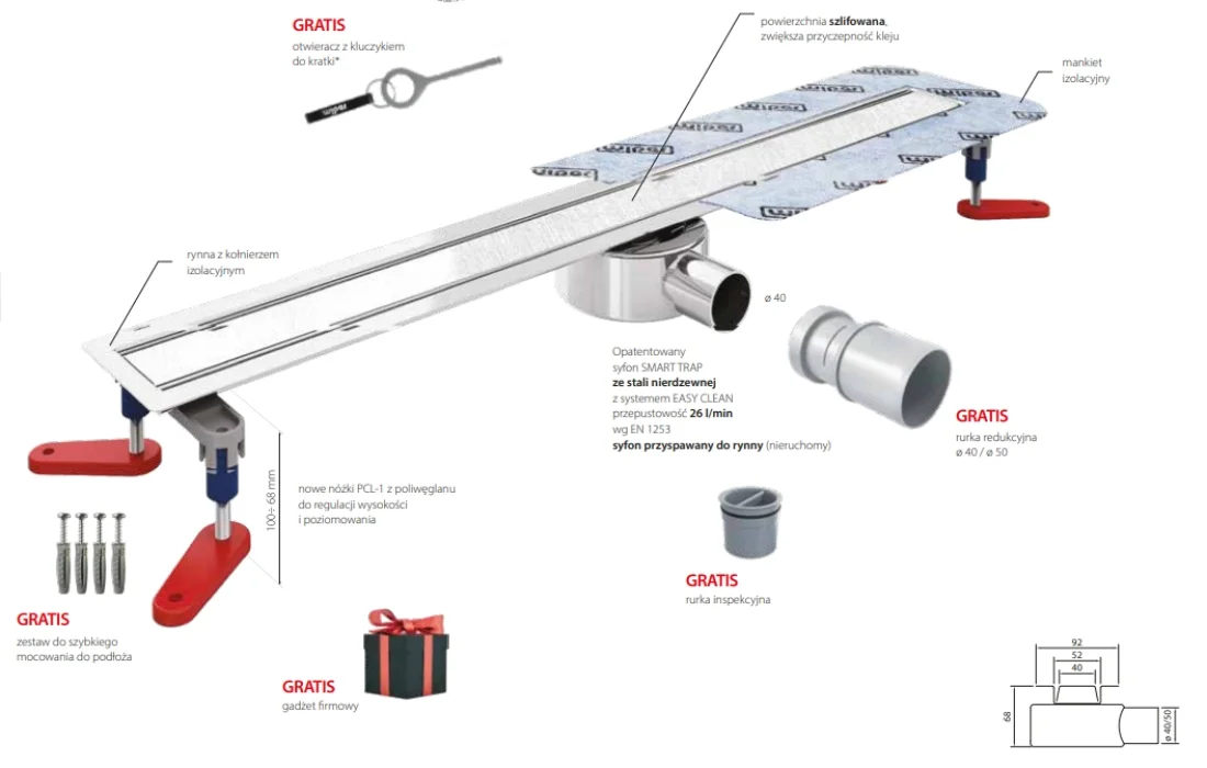 Rynienka odpływu New Invisible Slim 70 cm ma przymocowany na stałe niski syfon ze stali nierdzewnej SMART TRAP® o przepustowości 38 l/min i z systemem EASY CLEAN (łatwe czyszczenie od góry).