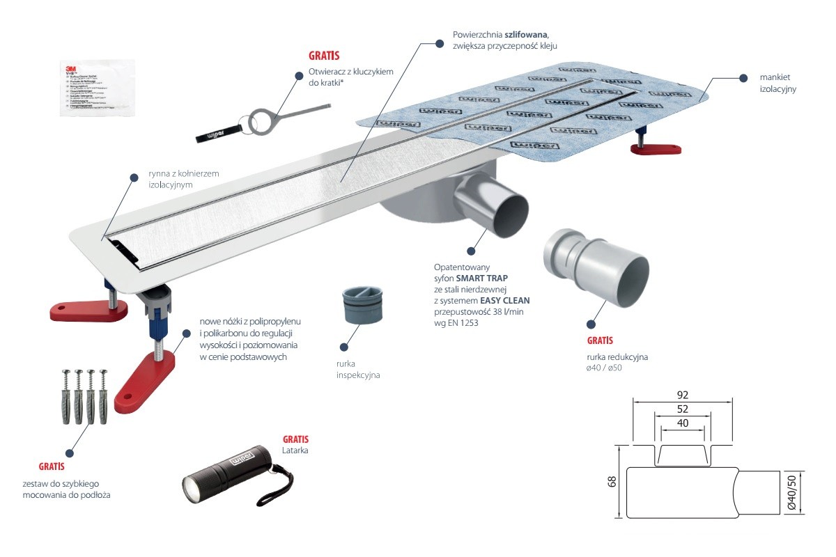 Rynienka prysznicowa INVISIBLE SLIM jest skonstruowana w taki sposób, aby była całkowicie niewidoczna. Umożliwia ona dowolnego rodzaju wykończenie (np. marmur, granit, gres, drewno egzotyczne), a widoczna pozostaje jedynie szczelina w posadzce przez które odpływa woda. Rynienka produktu Invisible Slim wykonana jest z wysokiej jakości stali nierdzewnej kwasoodpornej o symbolu 304. Po obróbce poddawana procesowi szkiełkowania, który nie tylko podnosi odporność na uszkodzenie metalu czy korozję, ale również wzmacnia jego strukturę.