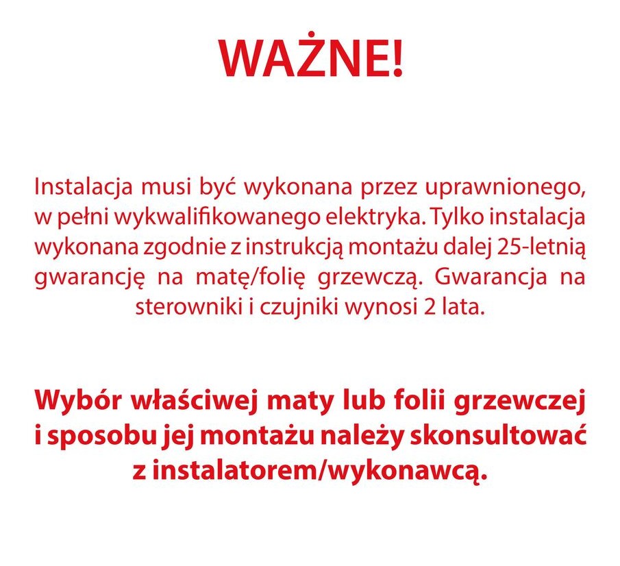 Dodatkowo wymagany jest sterownik z WiFi lub sterownik manualny oraz czujnik podłogowy (dostępny ze sterownikiem).