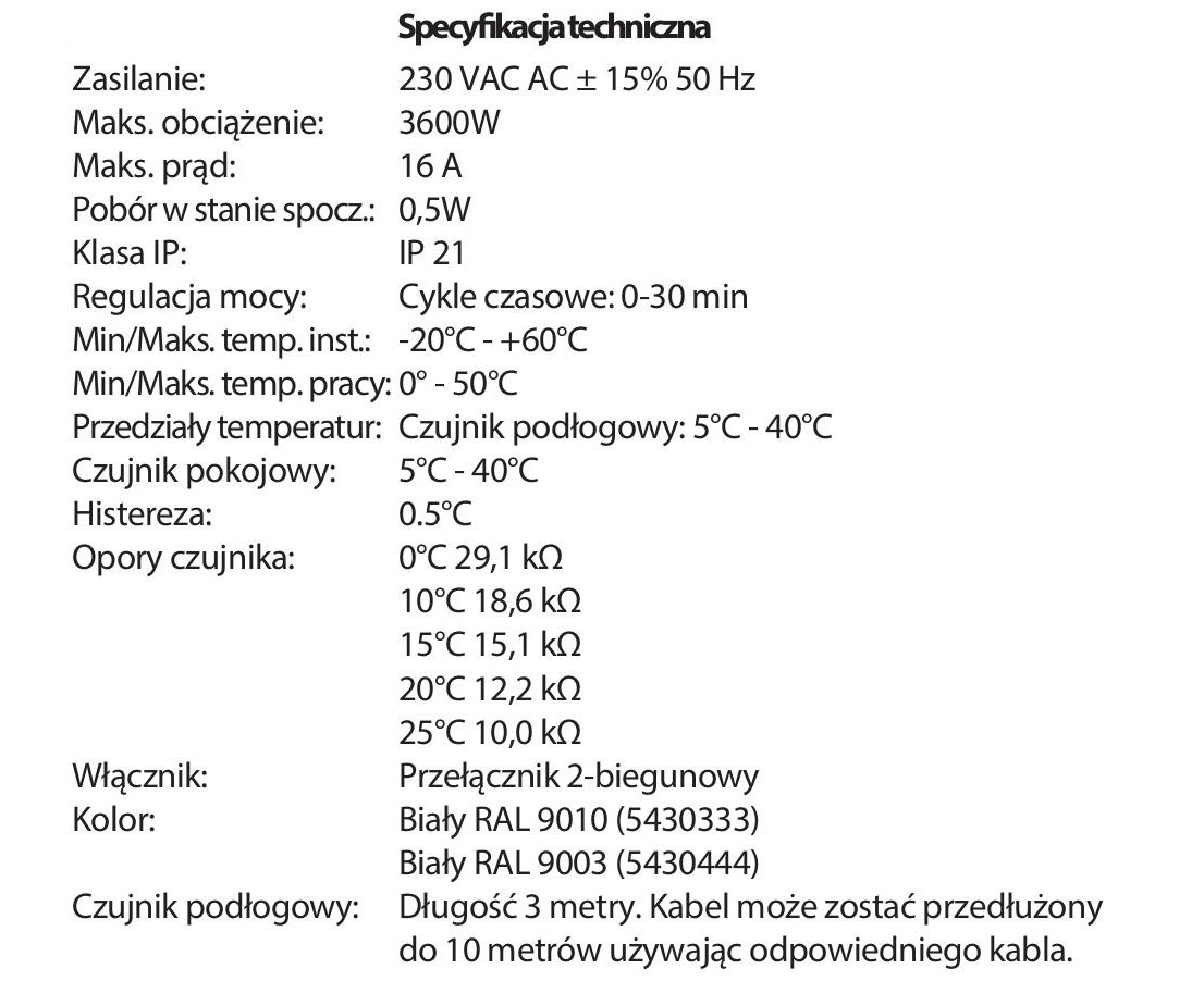 Termostat wyposażony jest w dwa czujniki – wbudowany czujnik powietrzny oraz czujnik podłogowy do podłączenia – co umożliwia dokładne utrzymanie żądanej temperatury w pomieszczeniu.